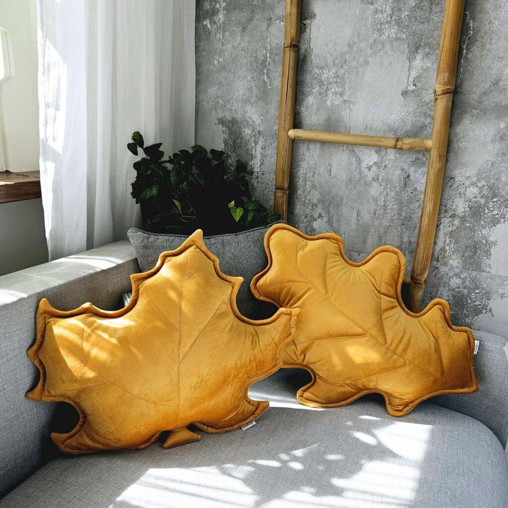 Zestaw trzech poduszek dekoracyjnych w kształcie liści (klonu, dębu i brzozy) ułożonych na szarej kanapie. Welurowe dodatki tworzą przytulny klimat w słonecznym salonie i są gotowym pomysłem na ocieplenie wnętrza bez remontu.