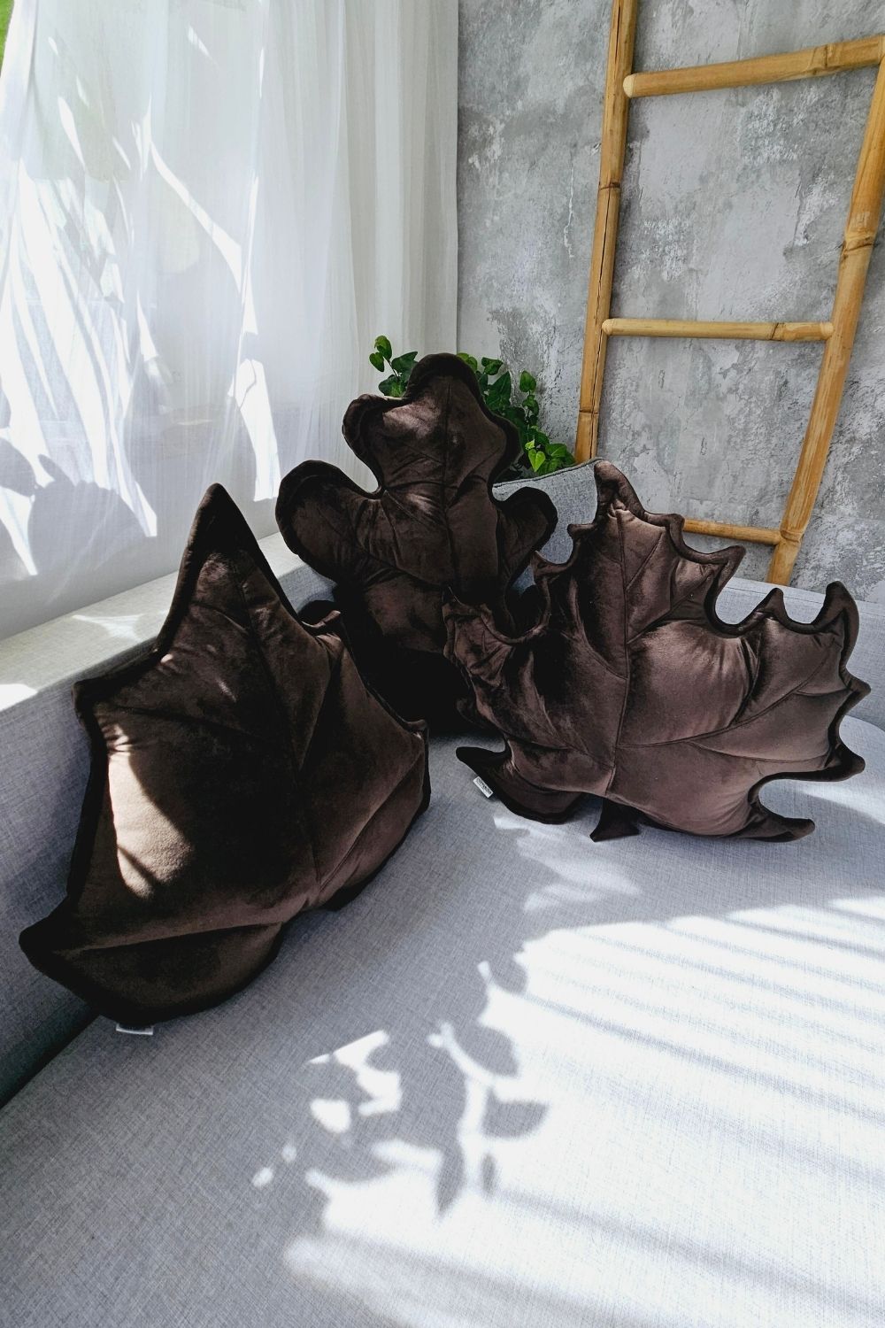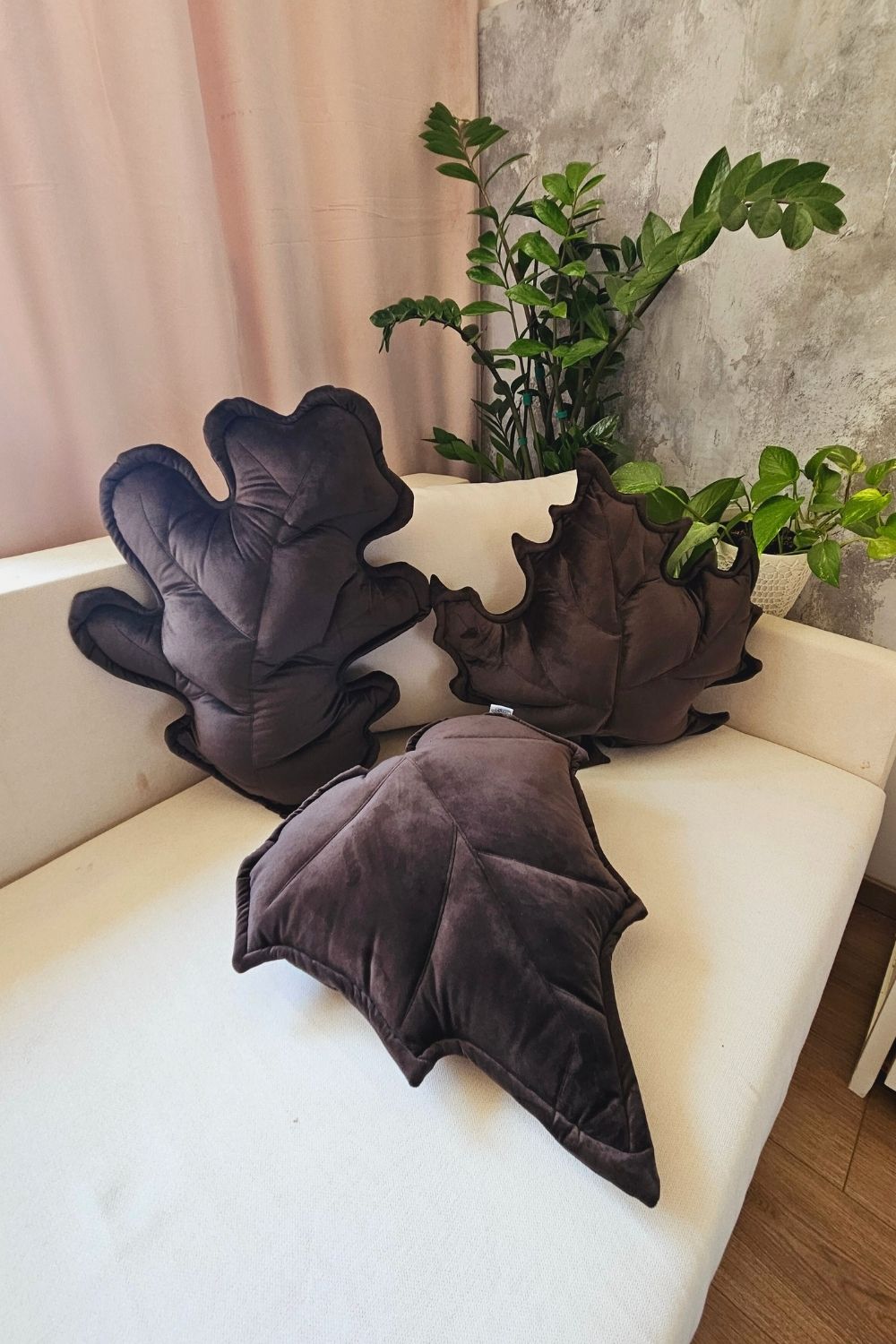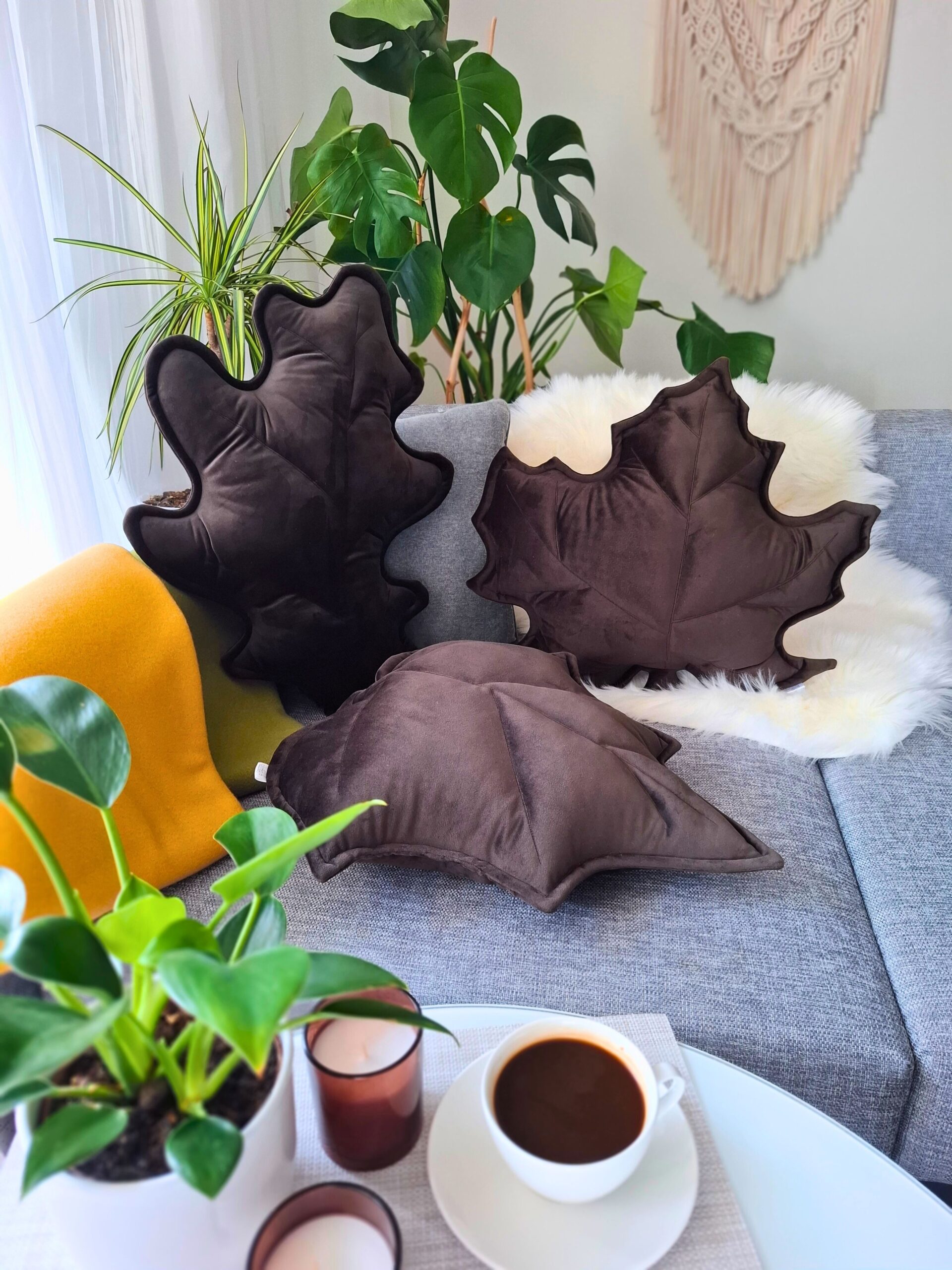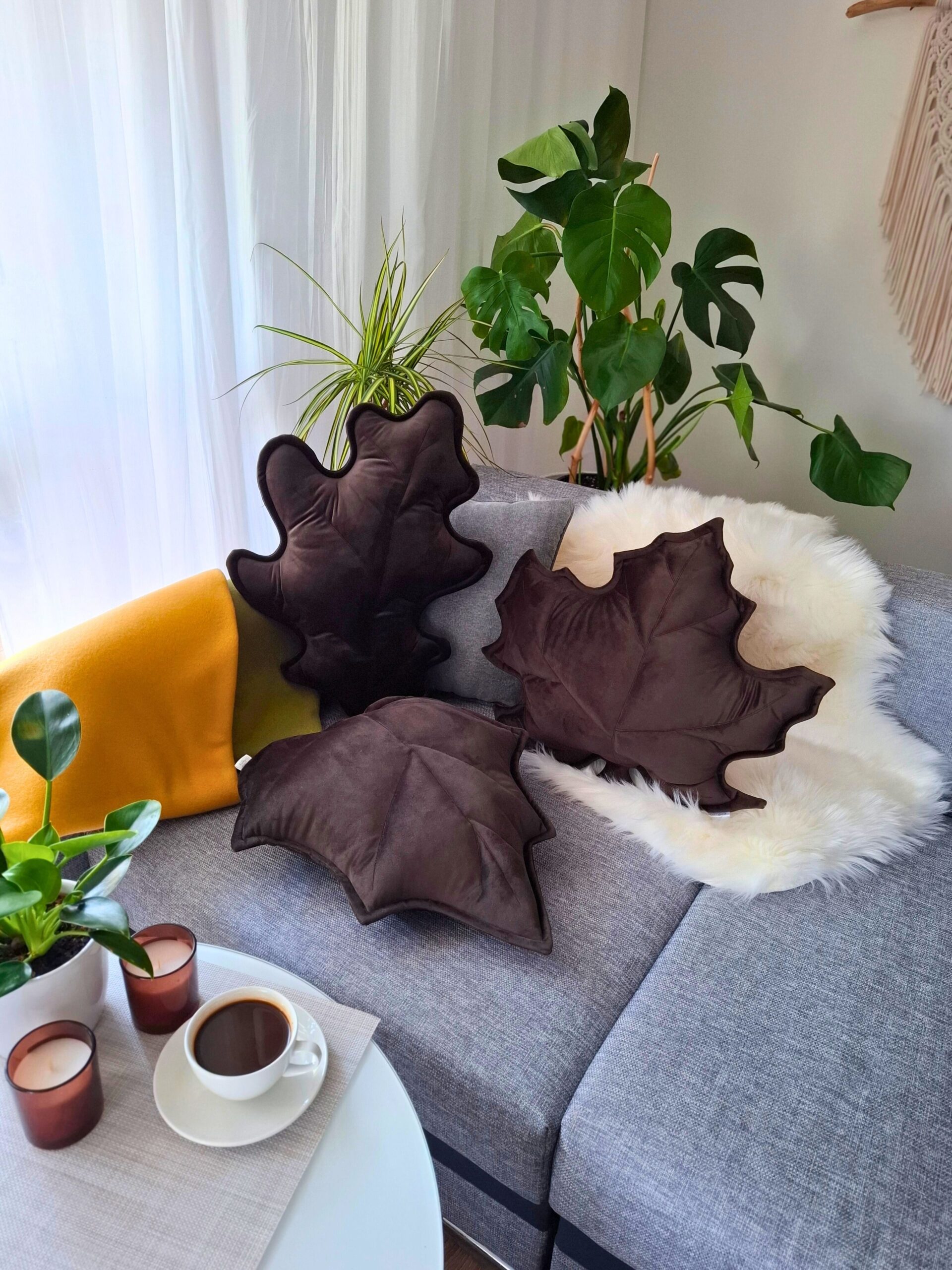 Najszybszym sposobem na ocieplenie wnętrza i nadanie mu luksusowego charakteru jest wprowadzenie tekstyliów w głębokich, czekoladowych odcieniach. Mój zestaw trzech welurowych poduszek w kształcie liści to gotowe rozwiązanie dla osób, które chcą przełamać monotonię jasnych ścian lub szarych kanap. Czekoladowy brąz to kolor, który natychmiast buduje atmosferę spokoju i elegancji, sprawiając, że Twój dom staje się przytulną enklawą inspirowaną naturą.