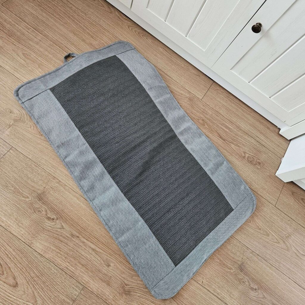 Praktyczny haczyk: Wszyty uchwyt pozwala na wygodne zawieszenie maty do wyschnięcia po praniu lub przechowywanie jej na ścianie, by nie zajmowała miejsca.