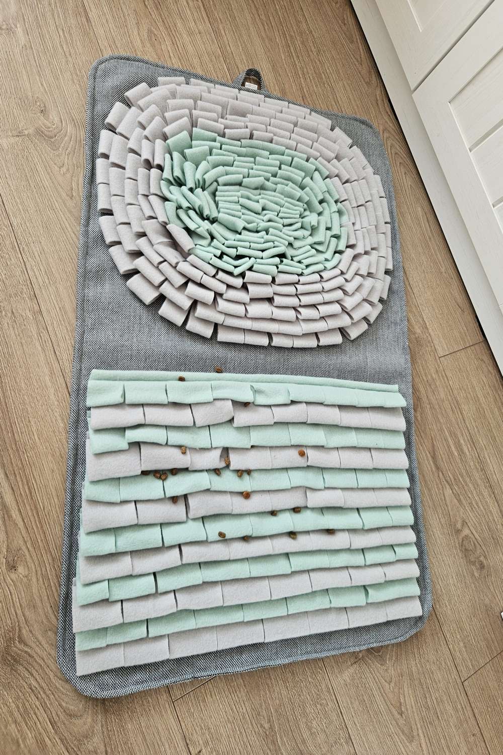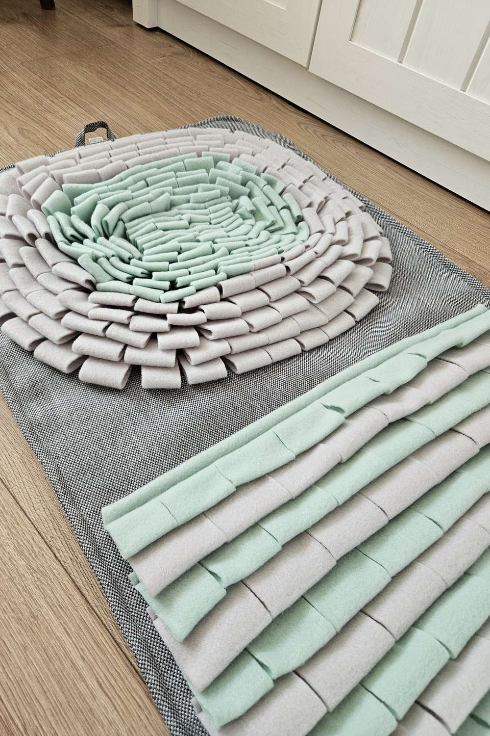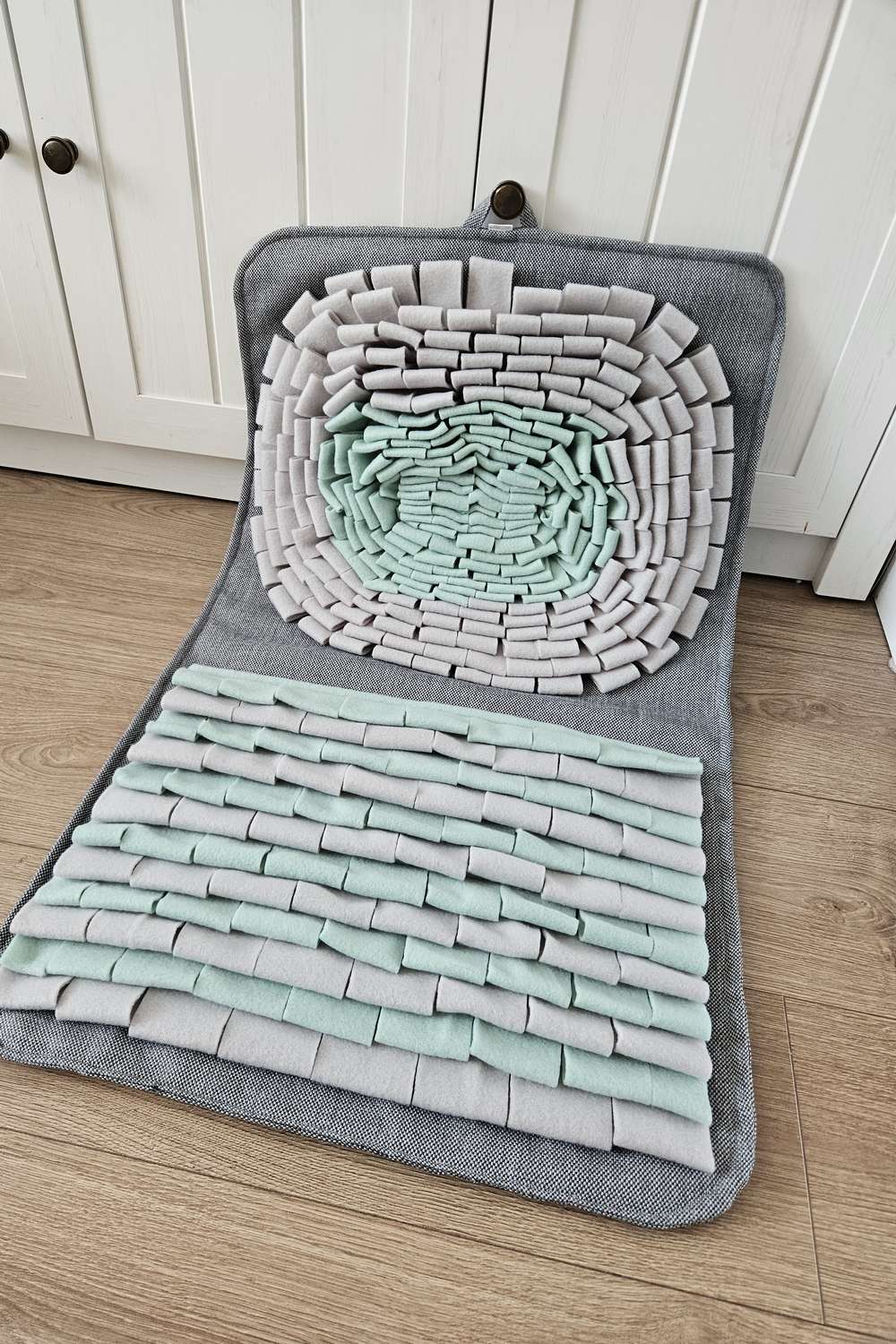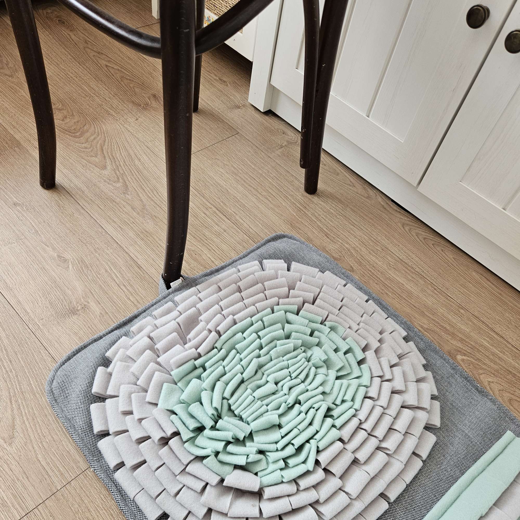 Szyję te szaro-miętowe maty z myślą o psach, które nie potrafią delektować się jedzeniem i potrzebują chwili wyciszenia po powrocie ze spaceru. Zamiast sypać karmę do miski, możesz ukryć ją między polarowymi paskami – dla Twojego pupila to świetna zabawa, która naturalnie zmusza go do zwolnienia tempa i skupienia się na węszeniu.