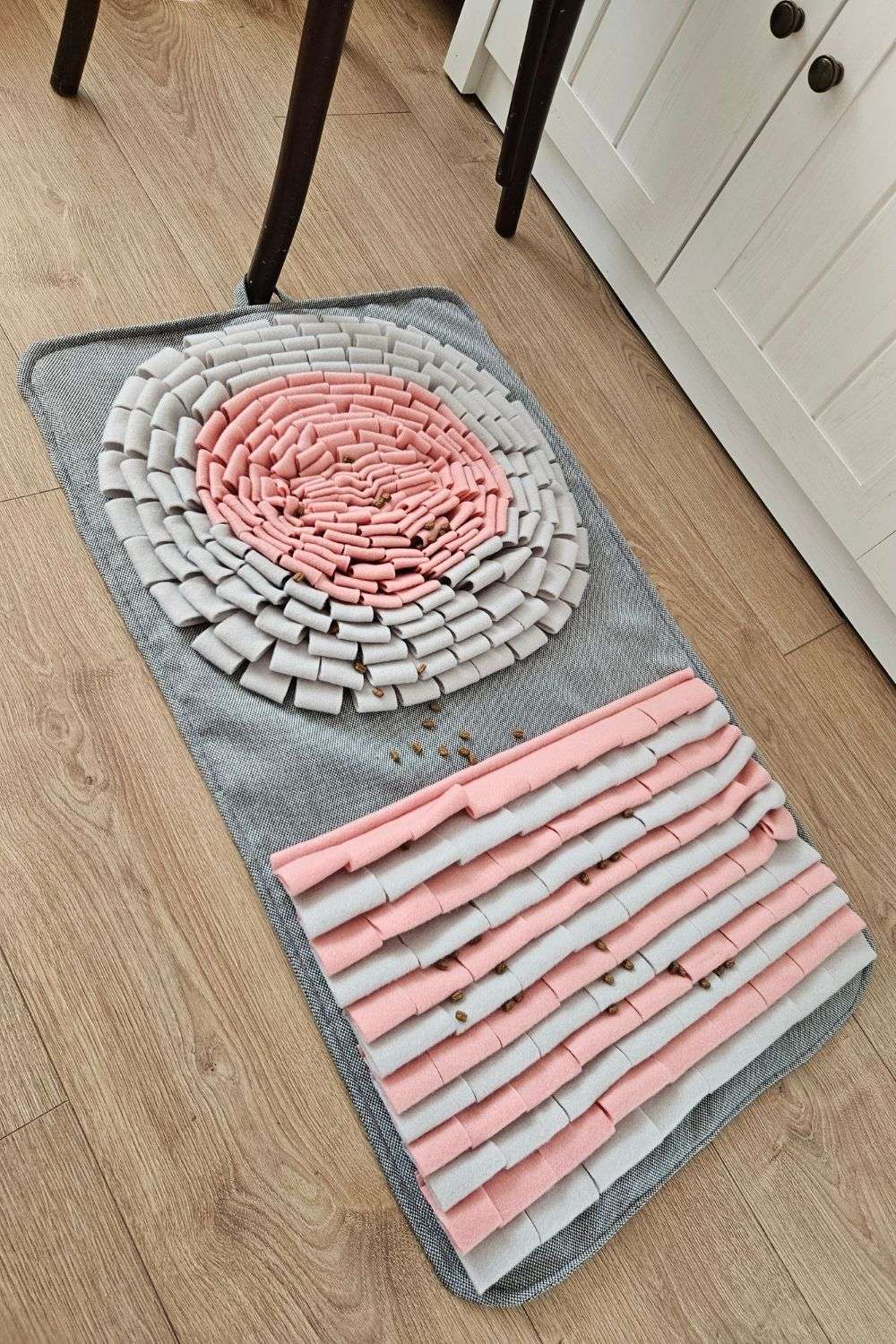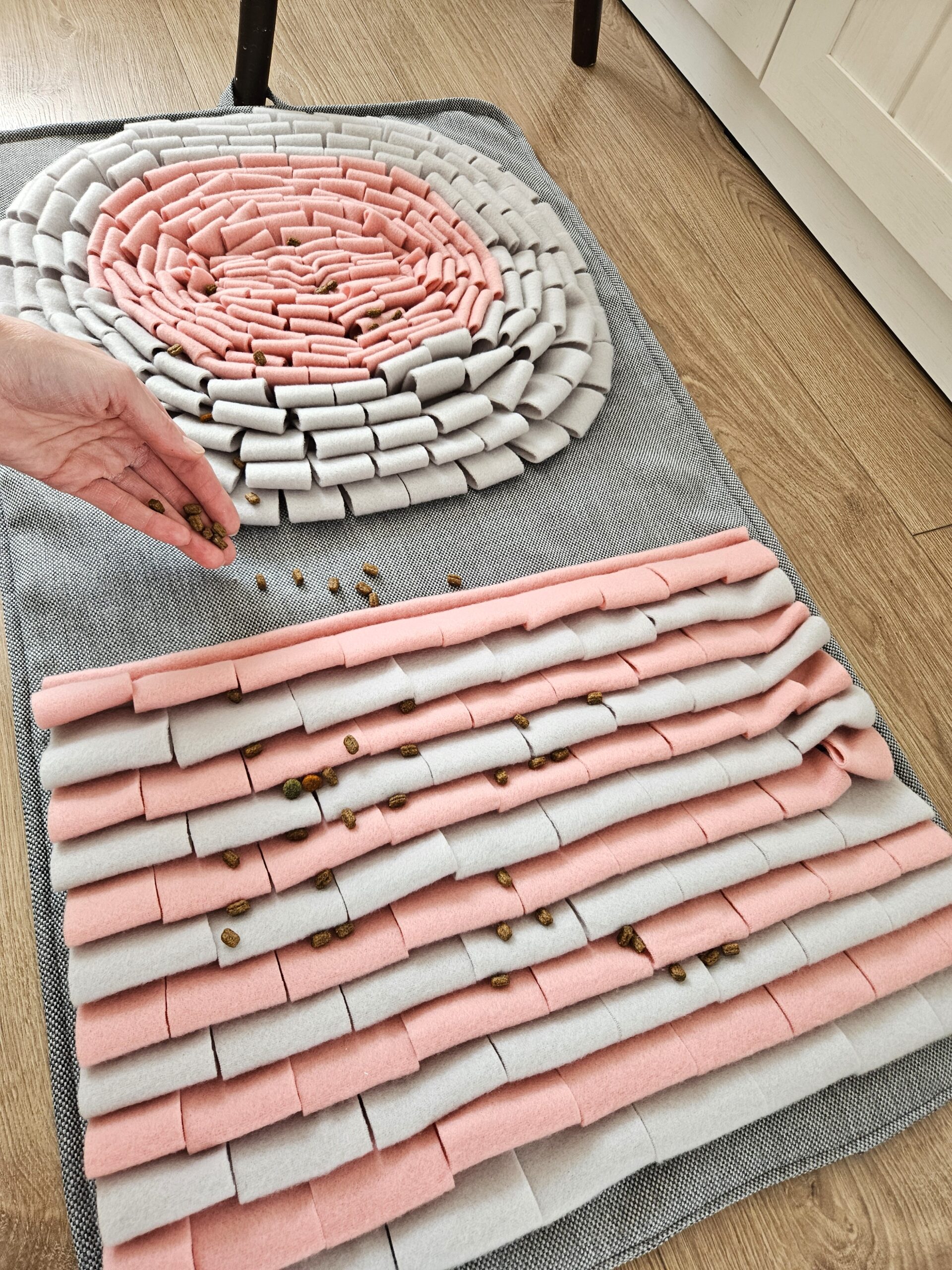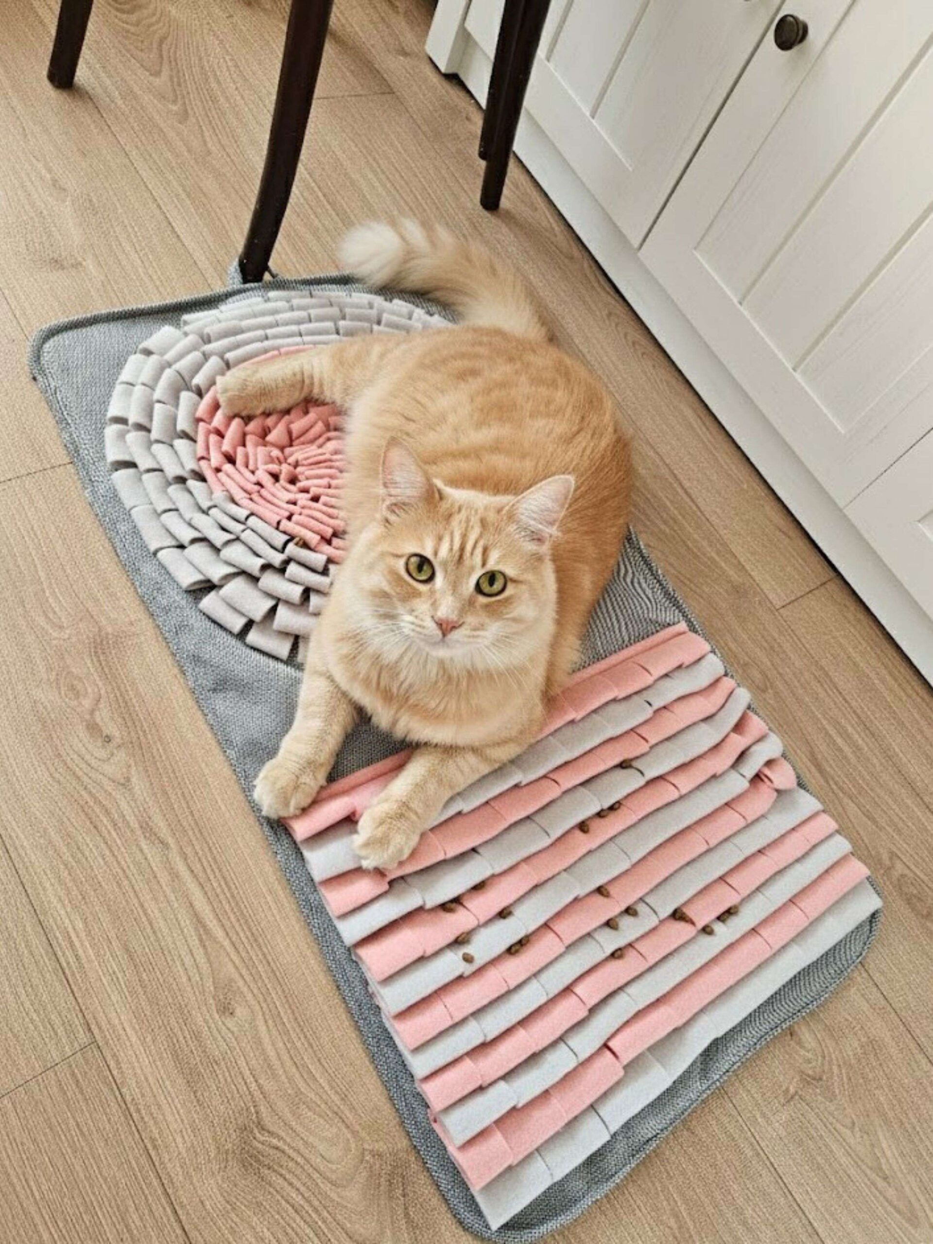 Widzę, że wiele kotów niewychodzących nudzi się, gdy zostają same w domu, a zwykłe wędki szybko przestają je cieszyć. Szyję te szaro-różowe maty, aby dać Twojemu pupilowi coś więcej – domowy poligon doświadczalny, który zamienia zwykłe podwieczorki w fascynujące polowanie na smakołyki. To prosty sposób na rozładowanie kociej energii i zajęcie go czymś, co kocha najbardziej: zdobywaniem pokarmu.