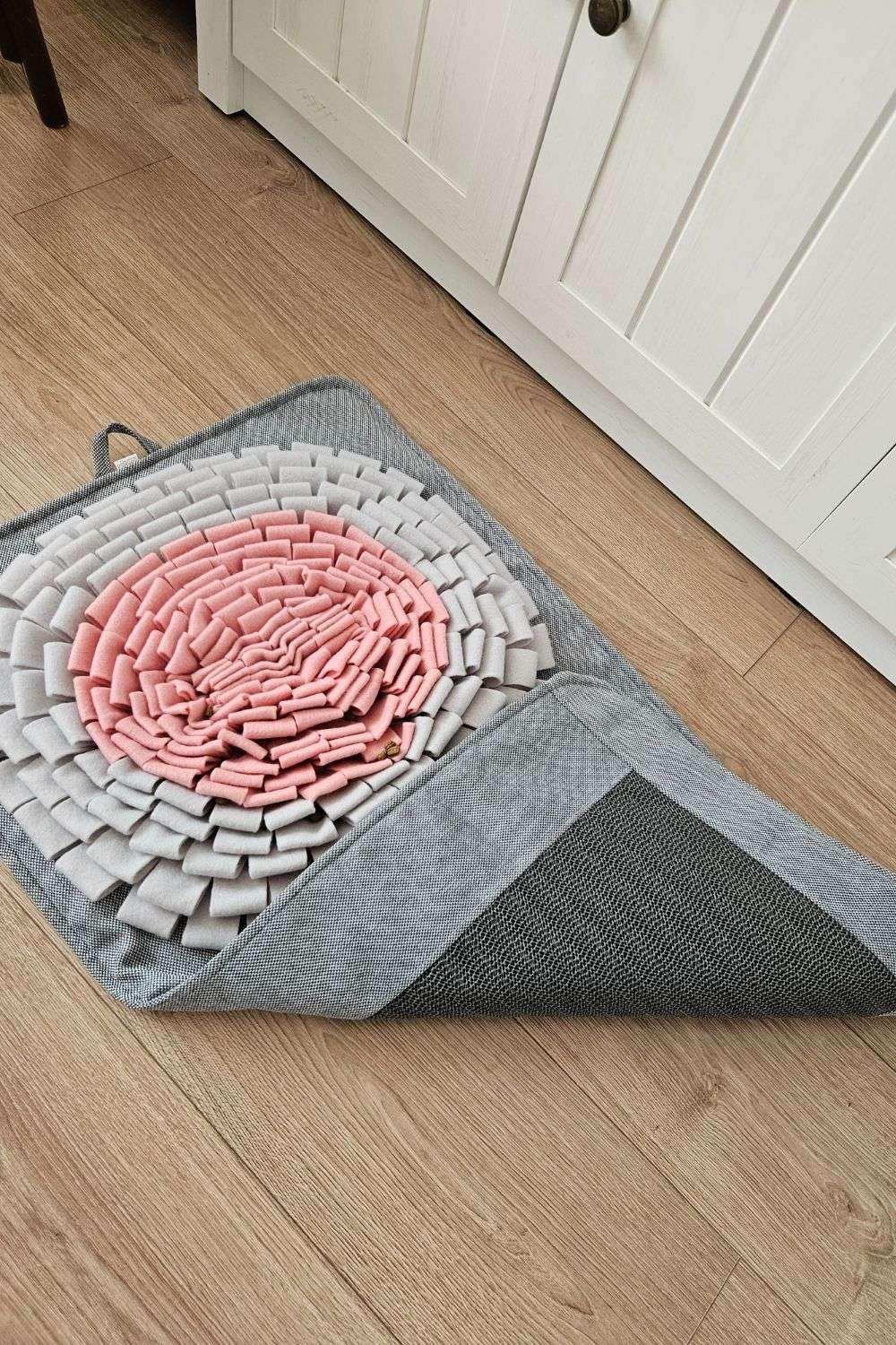 Mata, która się nie zwija: Używam trzech warstw materiału i solidnej bazy, co sprawia, że mata waży ok. 0,7 kg. Dzięki temu nie roluje się pod wpływem kocich skoków i stabilnie leży na podłodze.