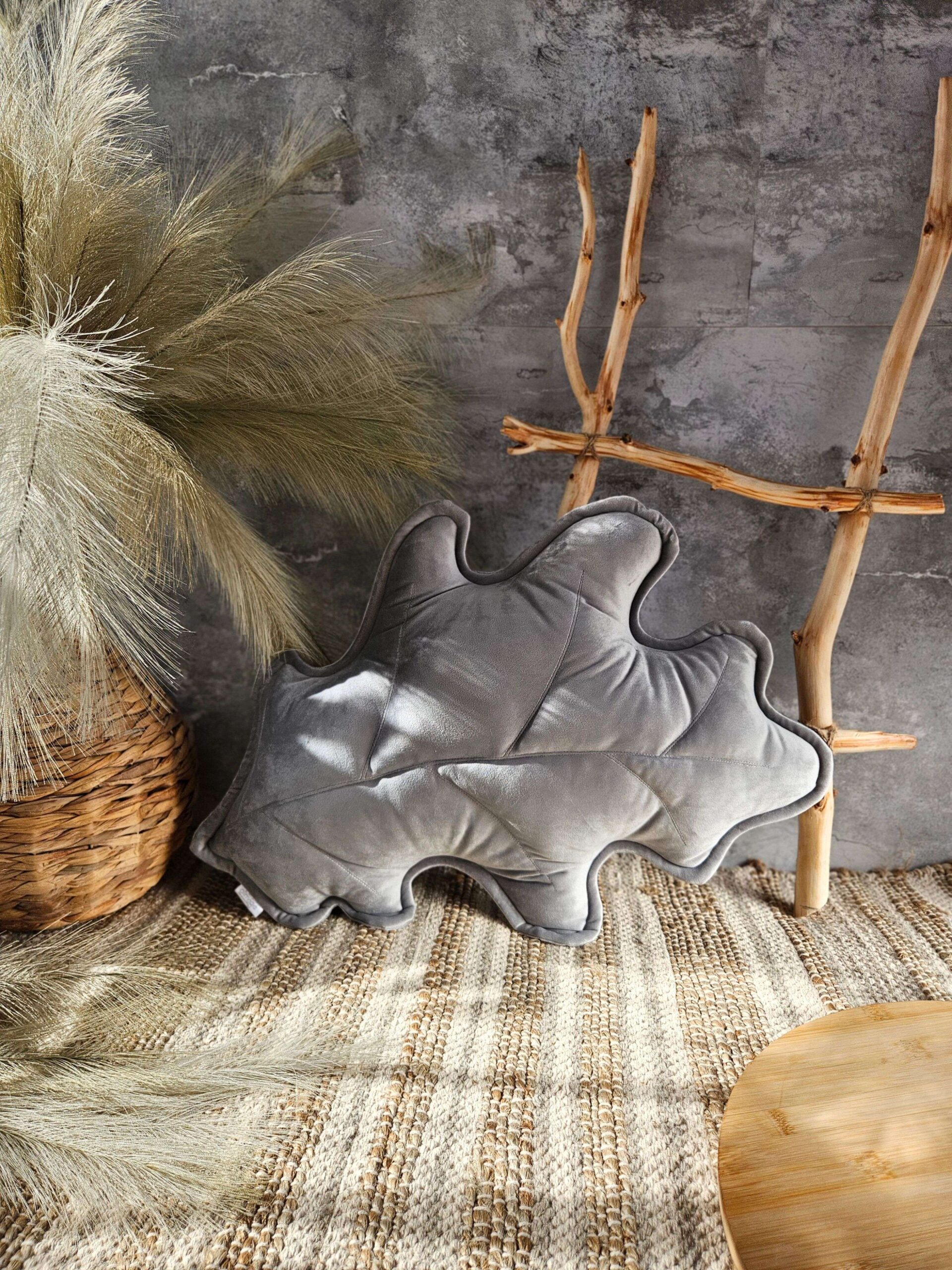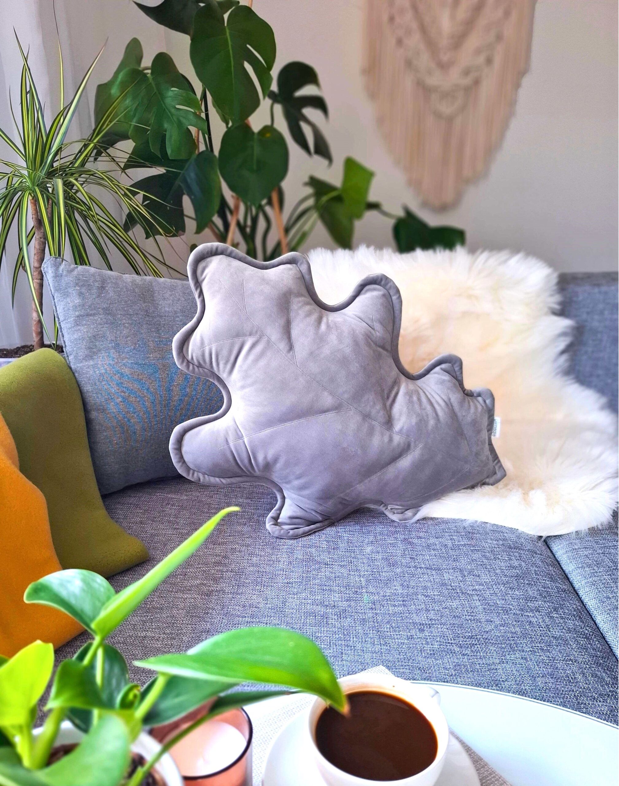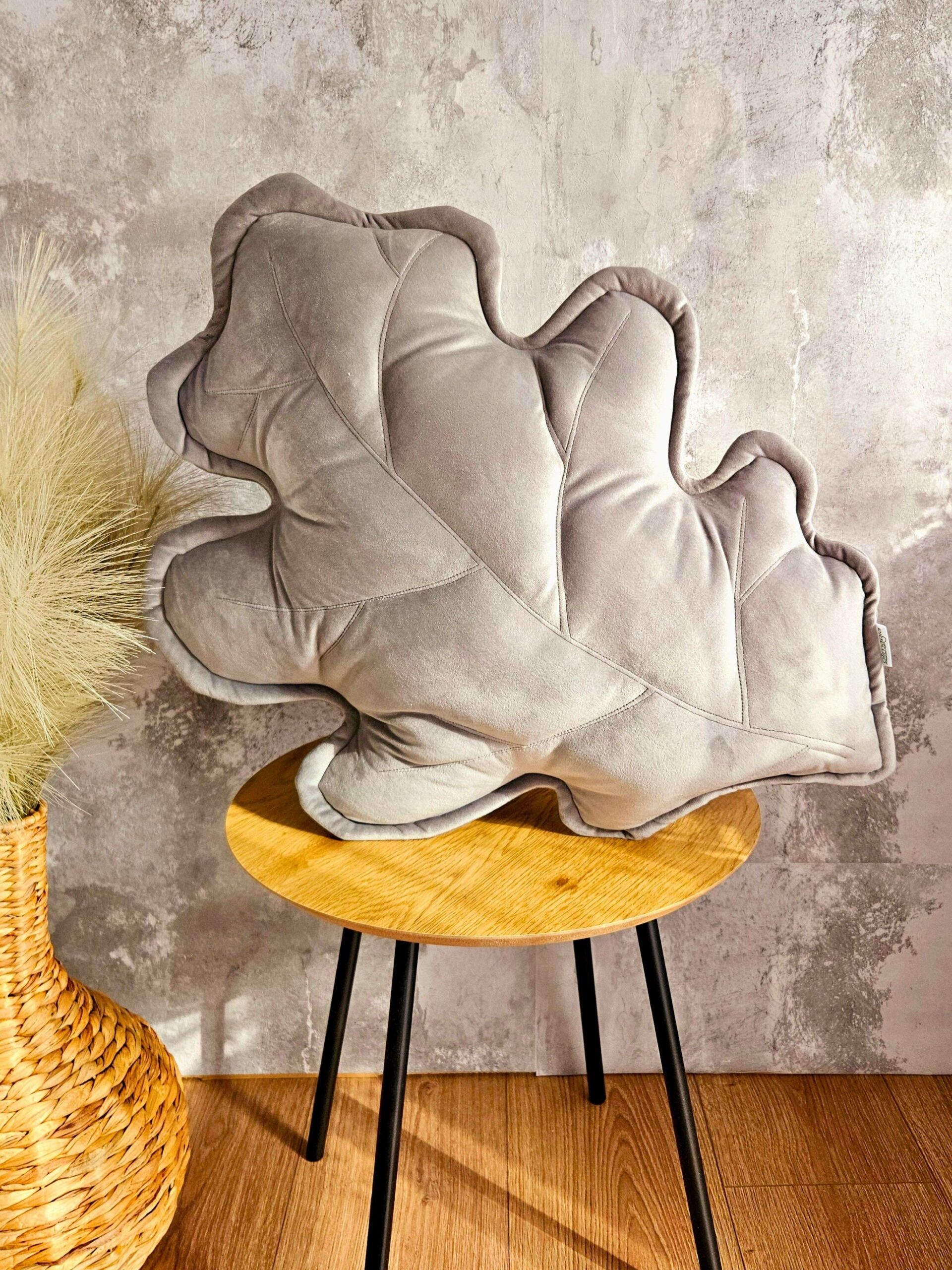 Szara poduszka dekoracyjna liść dębu – sposób na nowoczesną przytulność