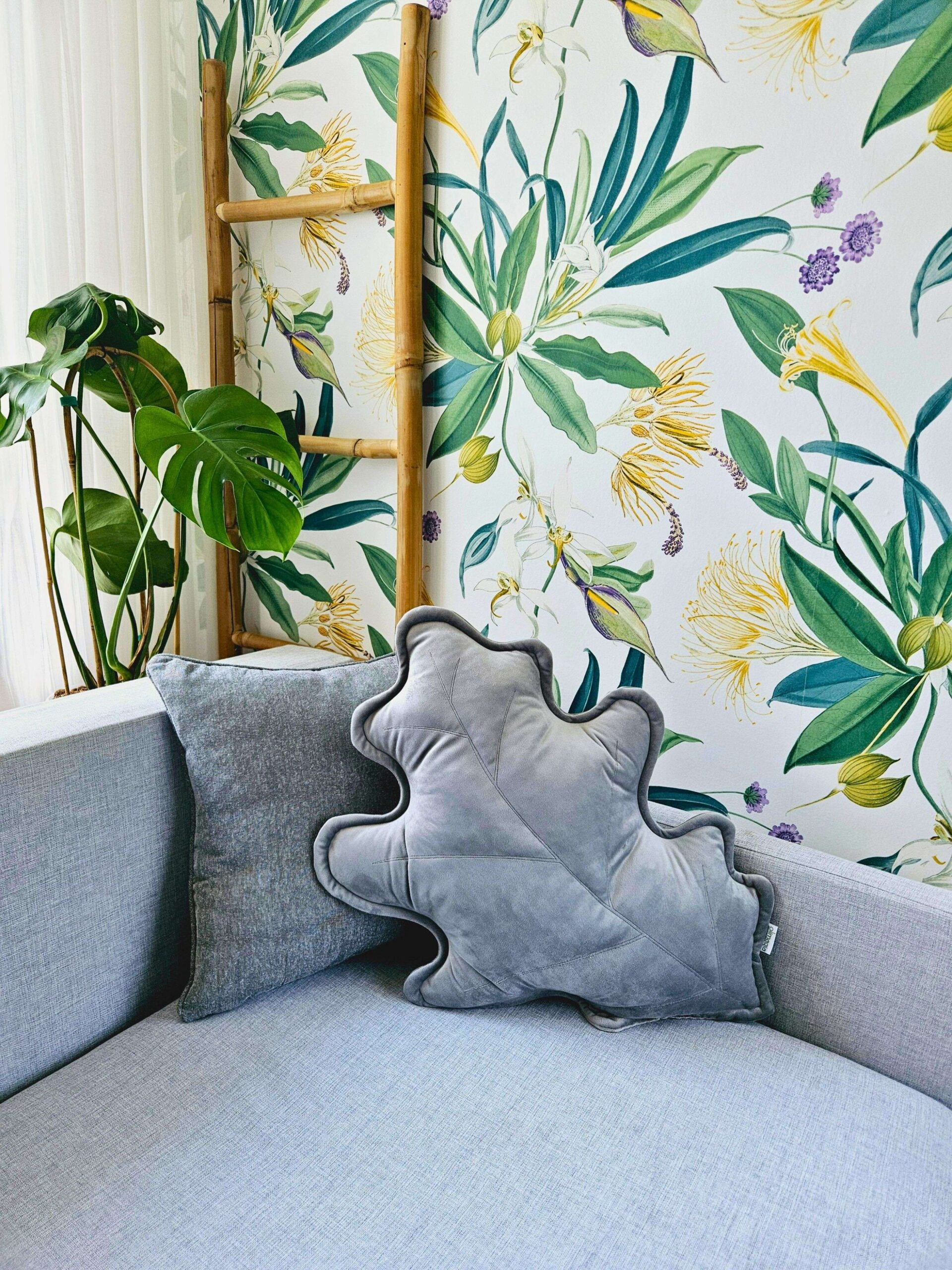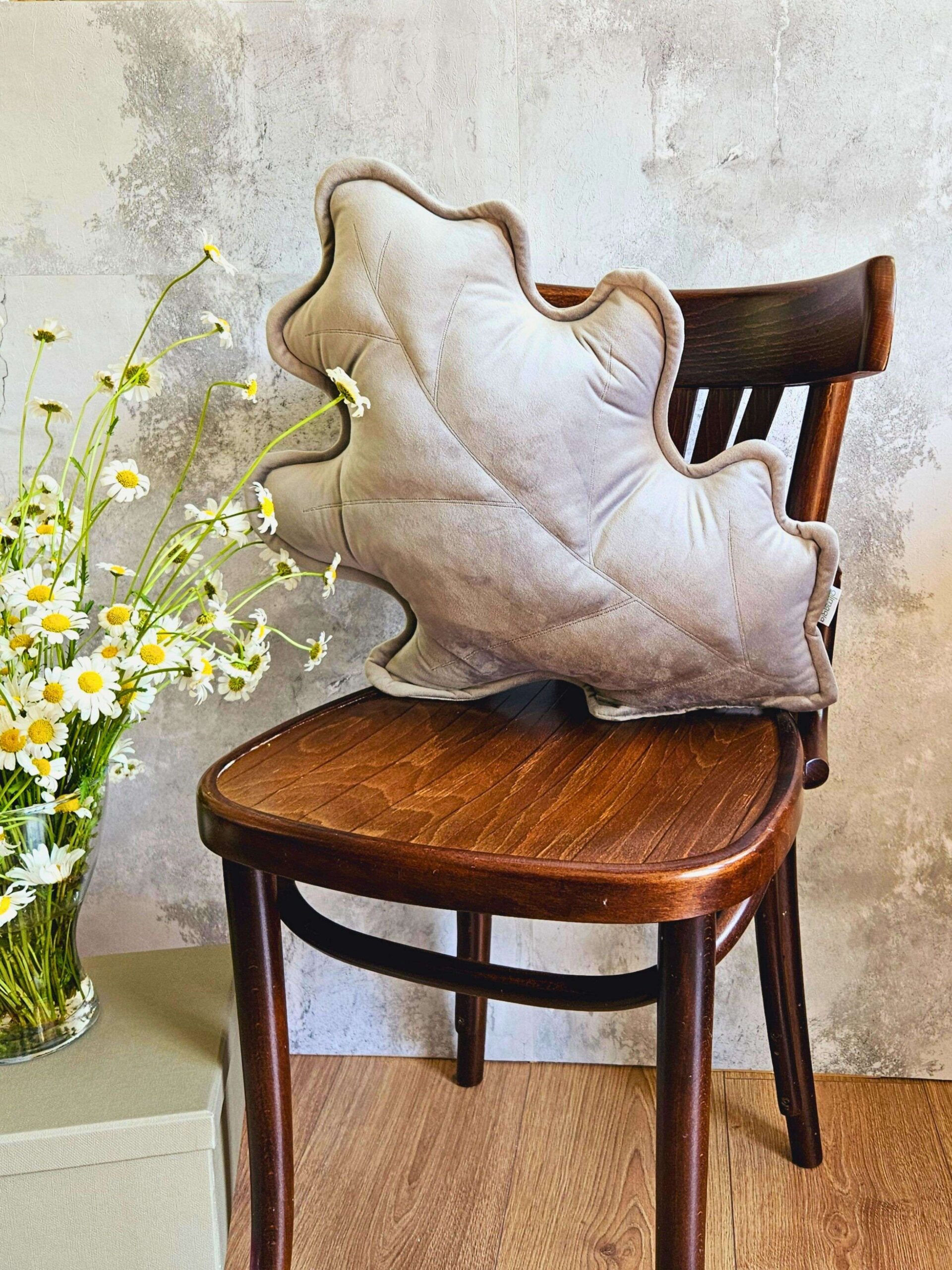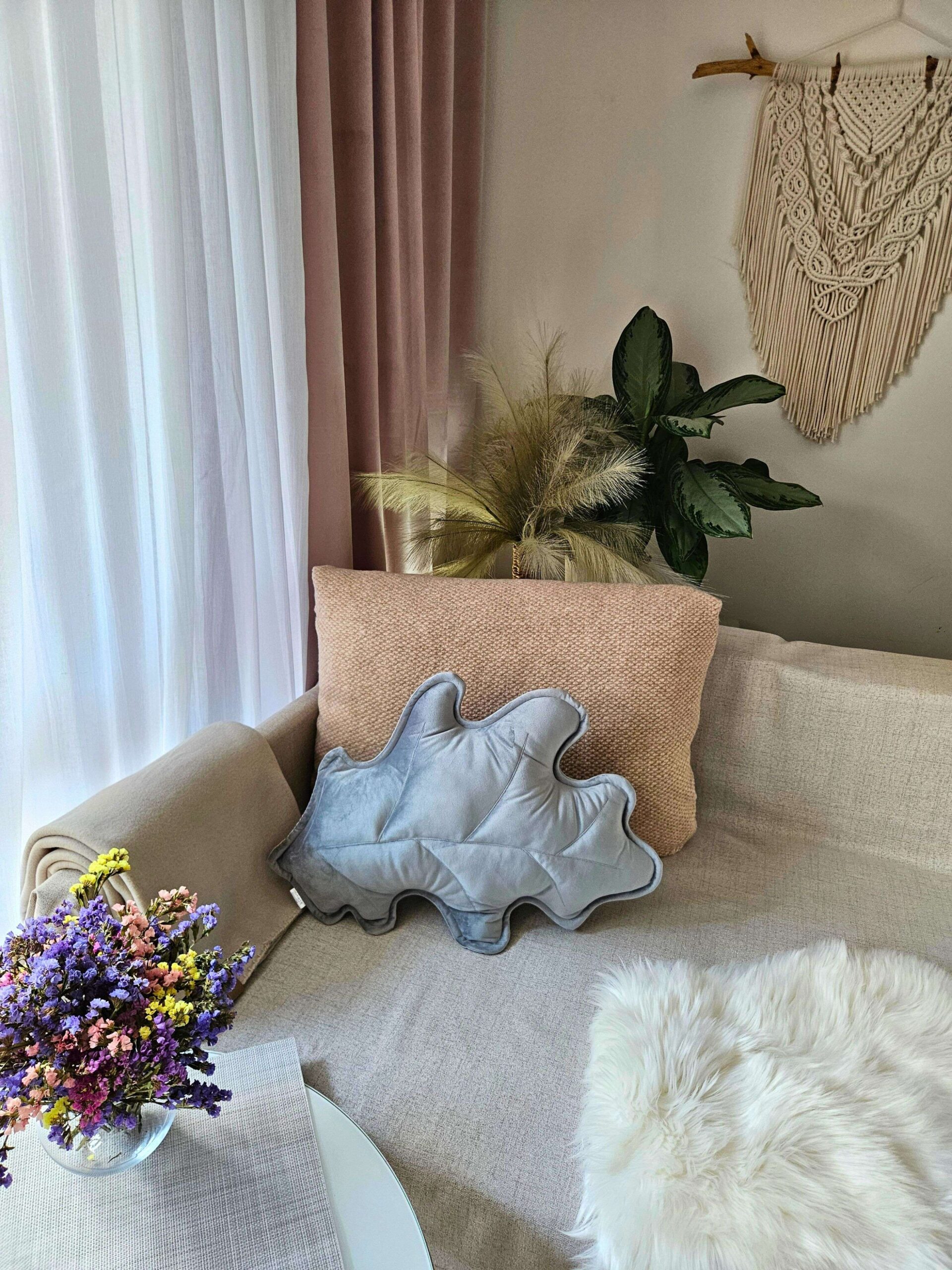 Szara poduszka dekoracyjna liść dębu – sposób na nowoczesną przytulność