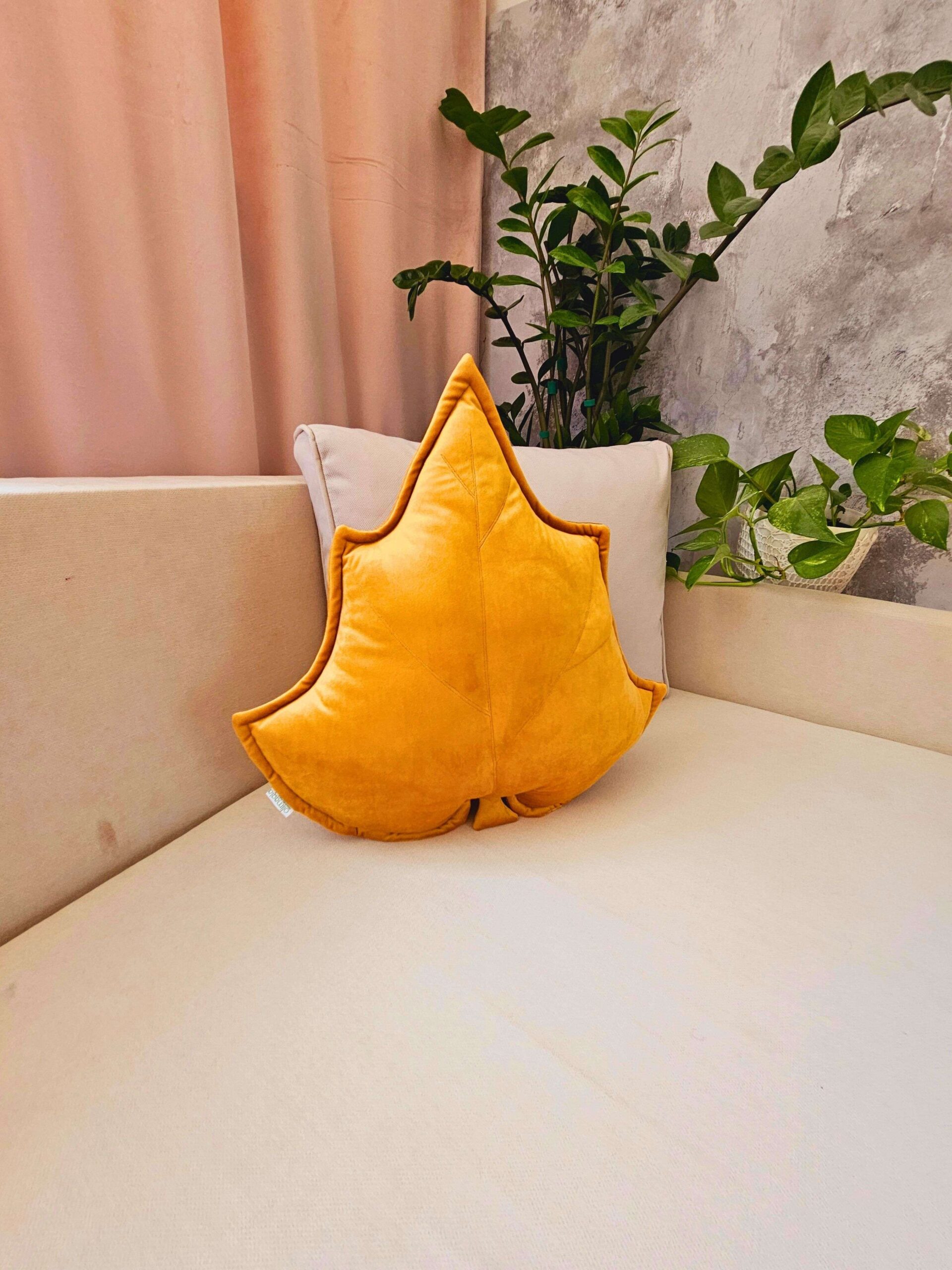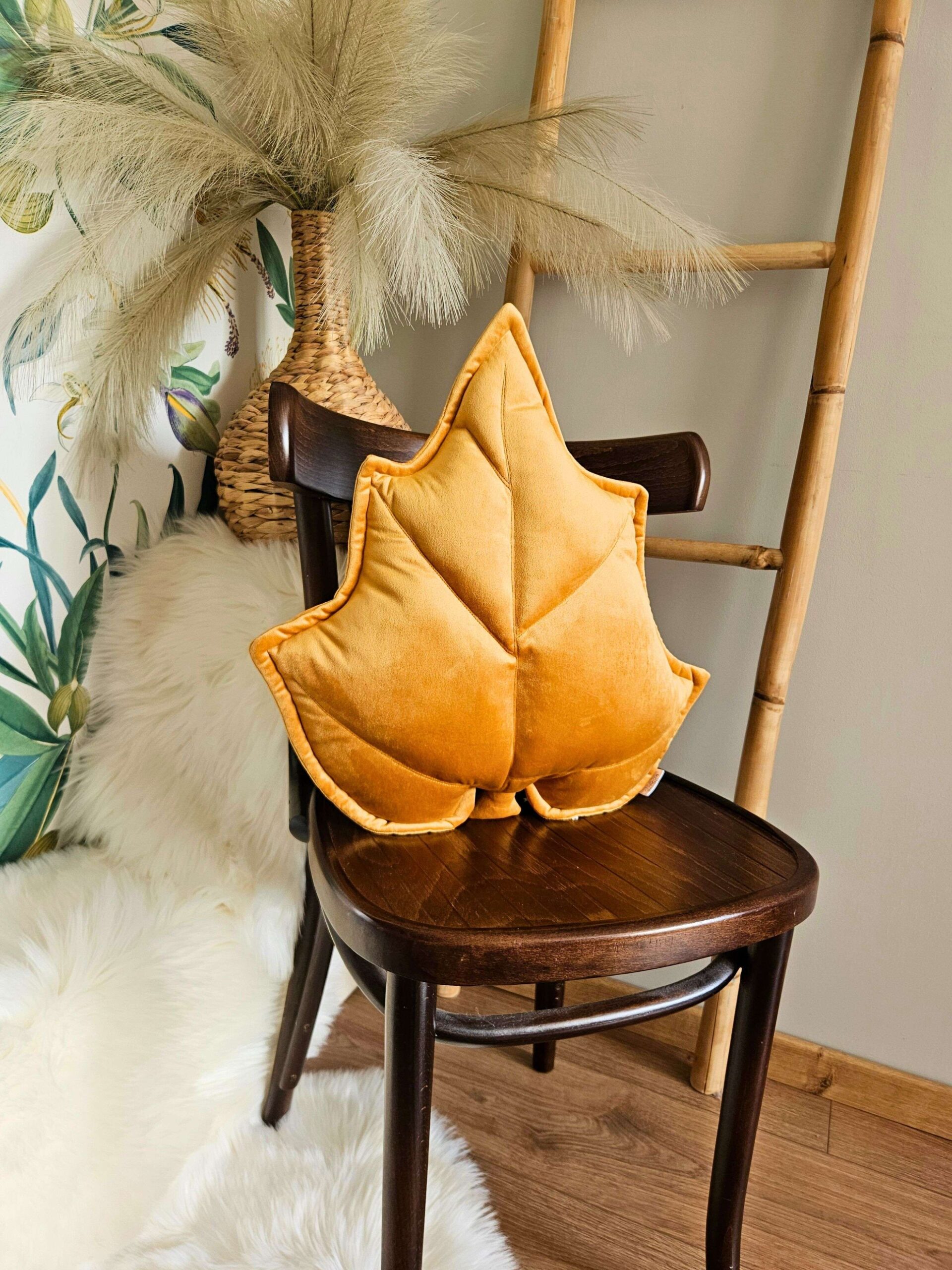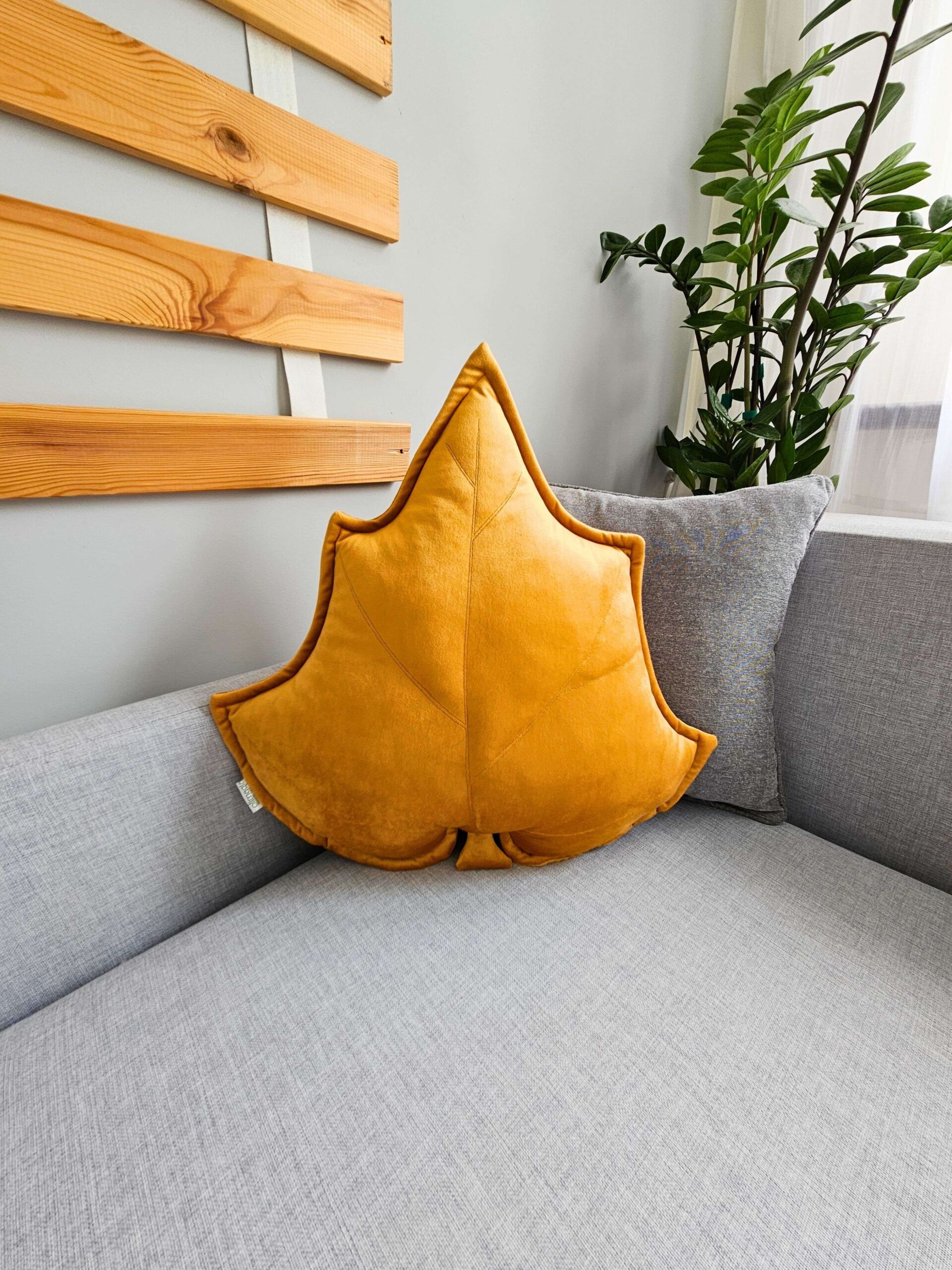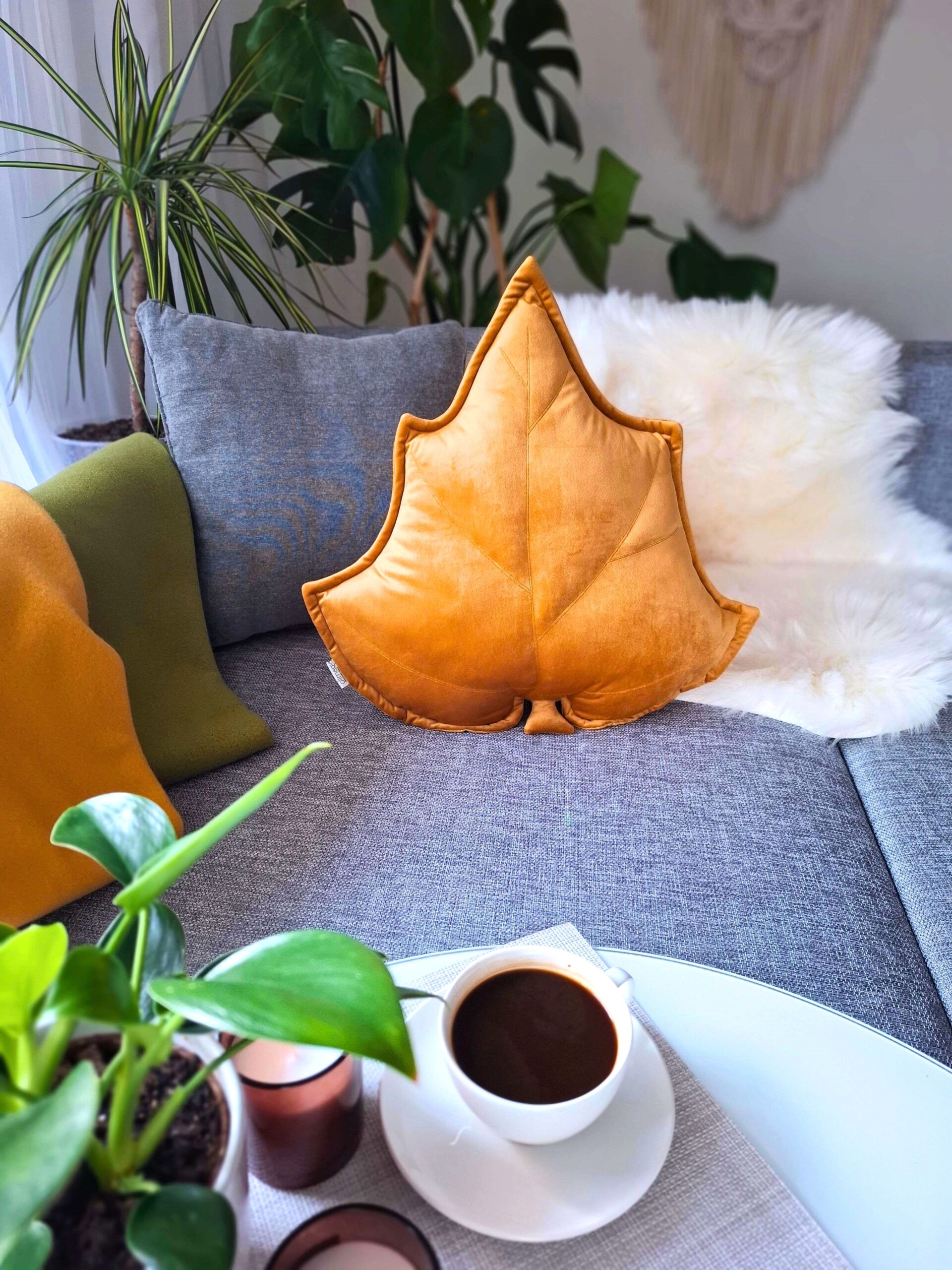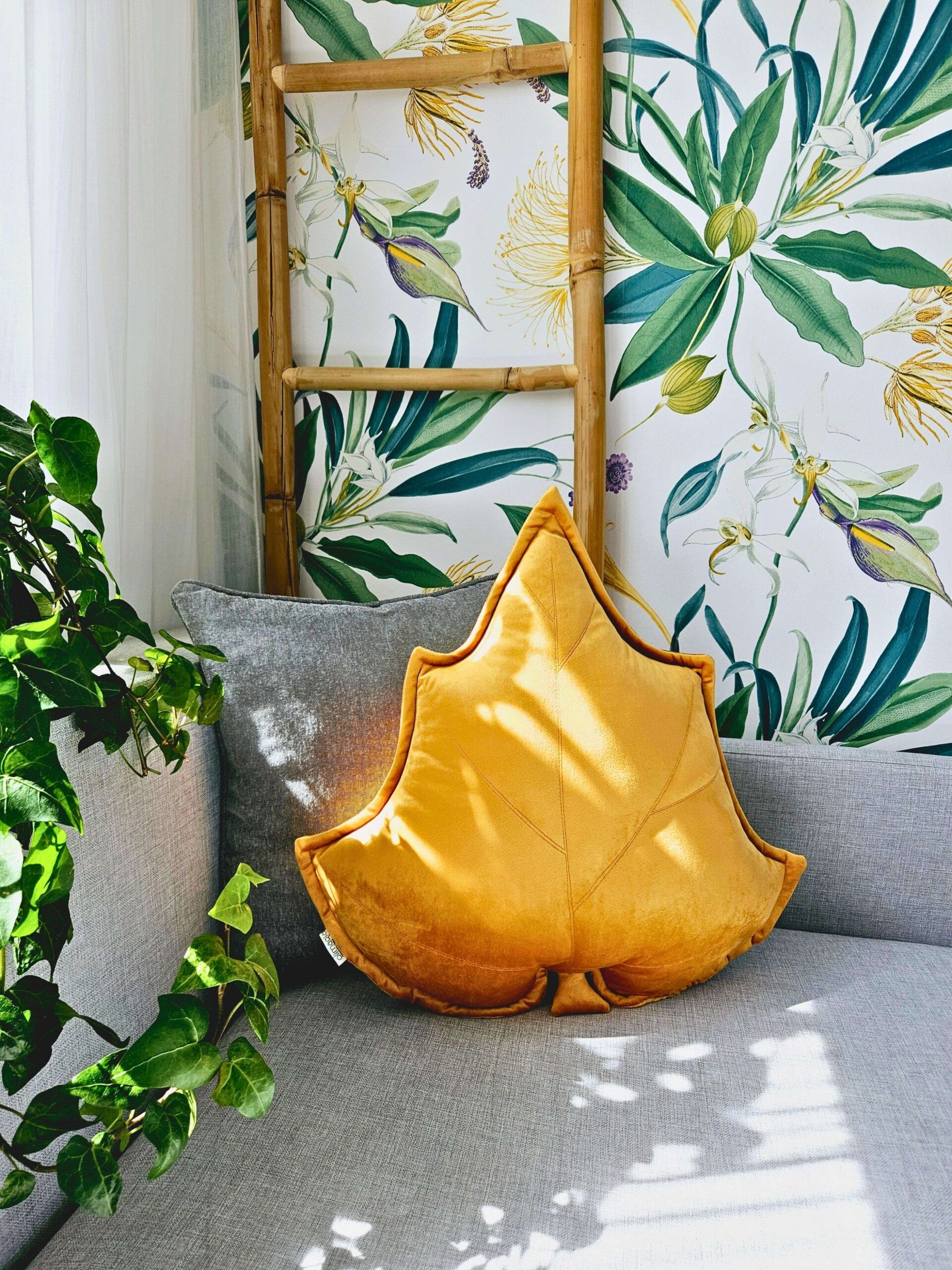 Żółta poduszka dekoracyjna liść brzozy – jak rozświetlić ciemny salon?